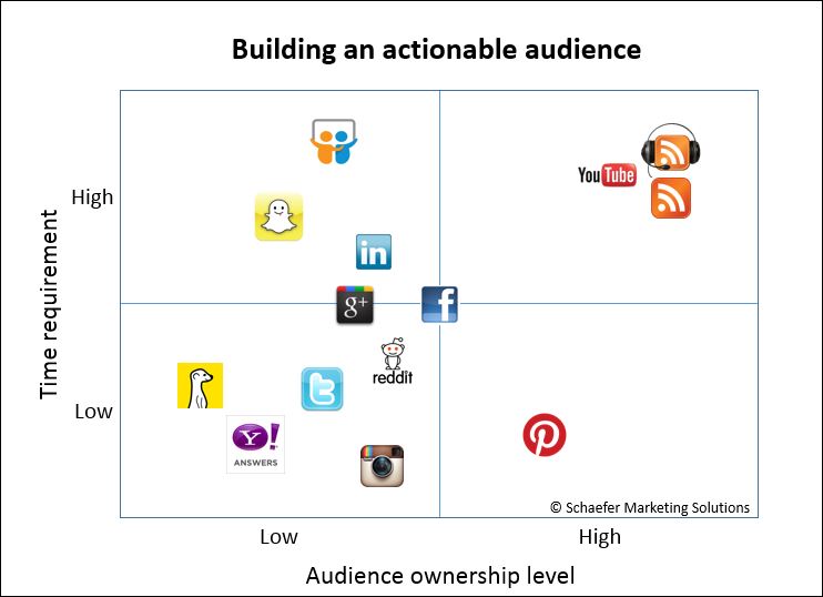However, G+ is nearly unparalleled in its ability to create passionate communities of fans who rally around a cause, a subject, or a person. There are wonderful communities dedicated to photography, cars, and tech, for example. You can certainly build an actionable audience on G+ but the platform trends toward the left on the chart because of its limited scope.